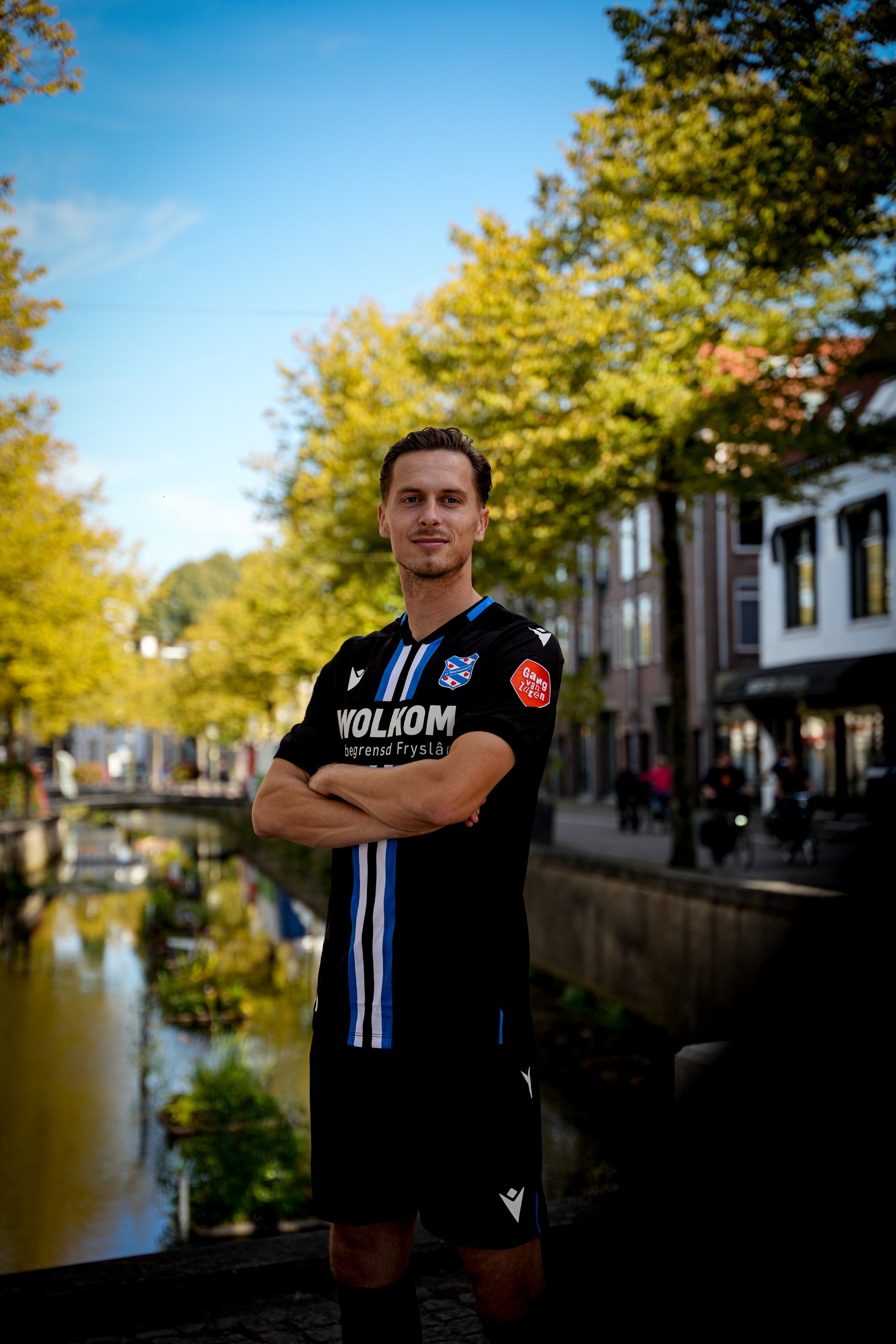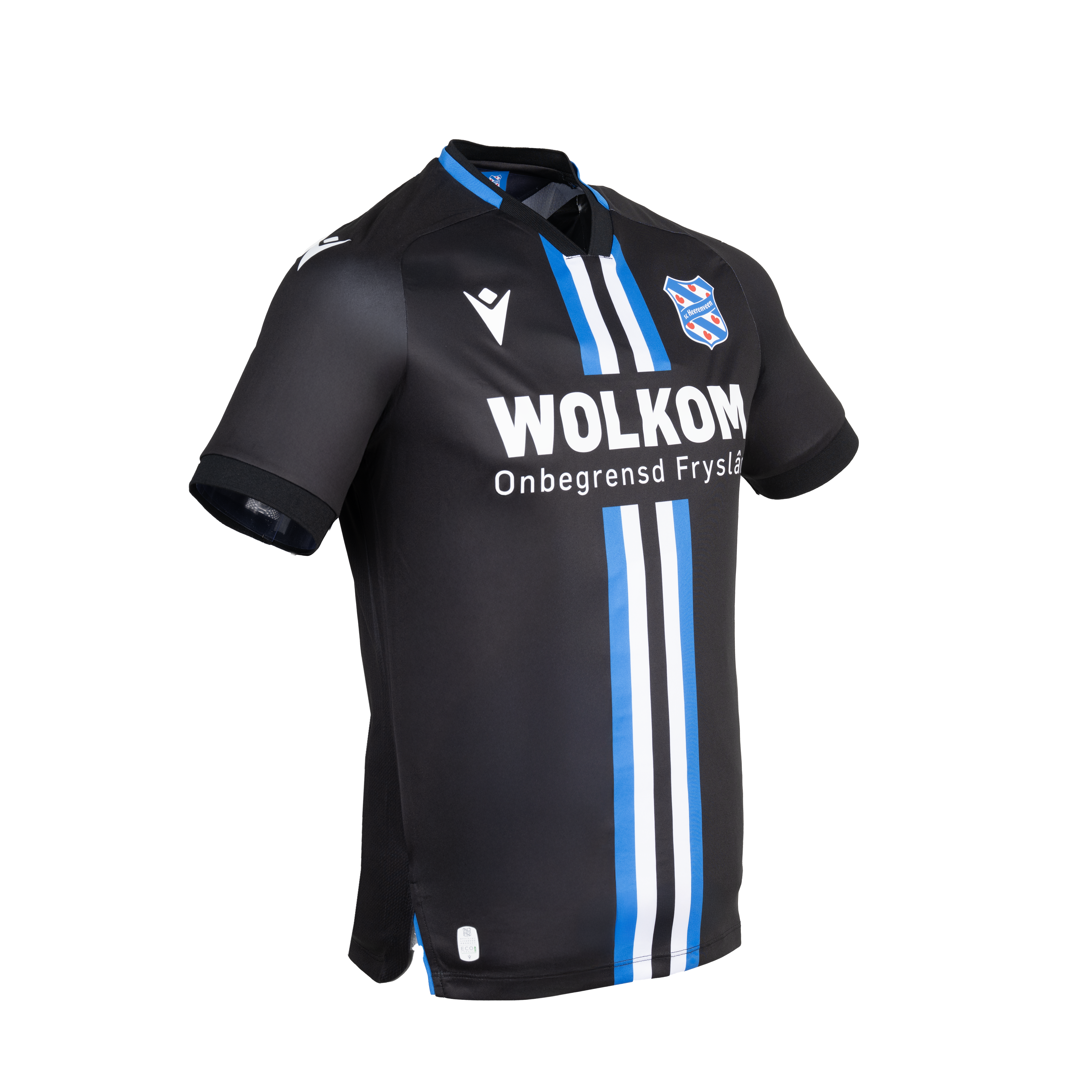 De vlag van Heerenveen is de inspiratie geweest voor de baan in het midden van het shirt. Hier prijken blauw, wit en zwart naast elkaar. Ook op de achterstand staat een duidelijke verwijzing naar ús doarp: de kroon die op de vlag staat, bevindt zich in de nek. Zo voelen wij ons altijd thús, waar we ook zijn.